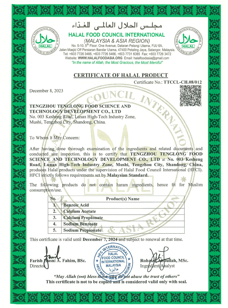 滕州市騰龍食品科技發(fā)展有限公司坐落在山東省滕州市木石鎮(zhèn)魯南高科技化工園區(qū),成立于1996年,前身是滕州市騰龍化工有限責任公司,公司專業(yè)生產(chǎn) 苯甲酸,苯甲酸鈉,丙酸鈣,丙酸鈉和醋酸鈣等系列產(chǎn)品。